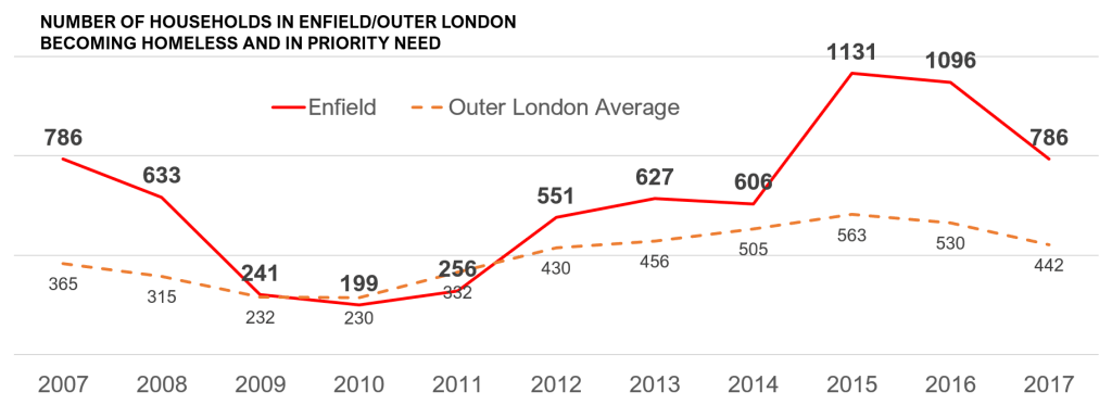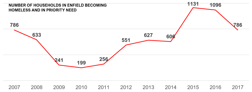 Each year around 650 families in Enfield become homeless and need emergency temporary accommodation. Rates of homelessness fluctuate, but since 2010 there has been a significant increase in the numbers of households becoming homeless.