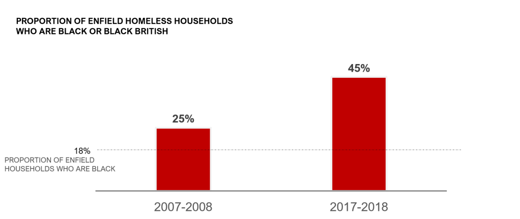 And the proportion of homeless families in Enfield that are black/black British has disproportionately increased over the past 10 years.