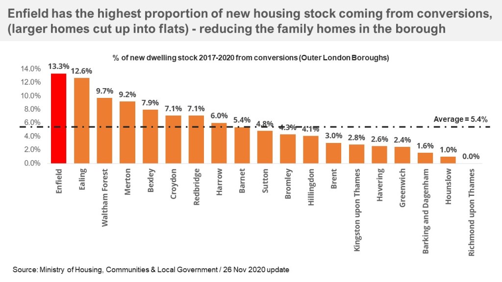 Figures also show that a high proportion of the new homes built in Enfield since 2017 (13.3%) have been conversions i.e. larger homes cut up into flats. This reduces the number of family homes in the borough, despite the desperate need for family housing.