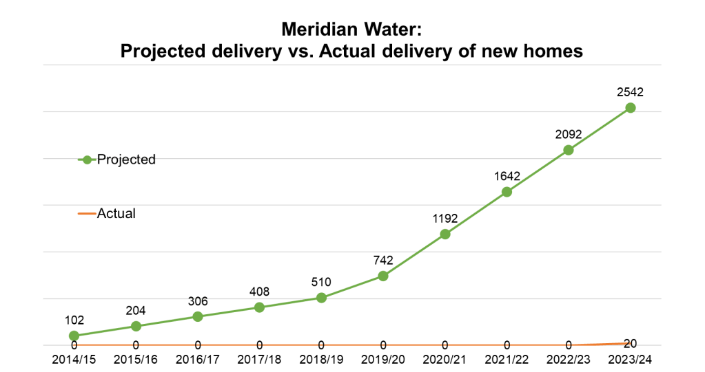 In 2009/10, Enfield Council claimed over 2,500 new homes would be built at Meridian Water by 2023/24. However, only 20 have been completed – that’s less than 1% of the projected number. [1,2]