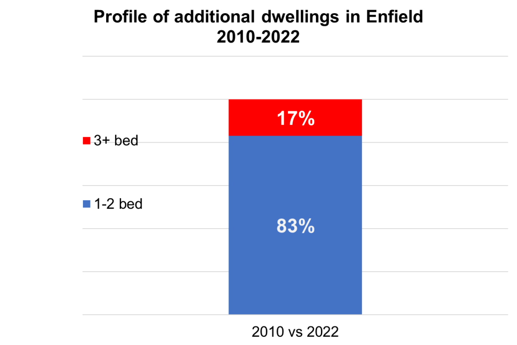 In 2010, it was estimated that over 60% of new homes in Enfield should have three or more bedrooms to reflect the needs of the borough’s families, but less than 20% actually met this criterion. One reason for the shortfall was the failure of Median Water to deliver the family homes projected.